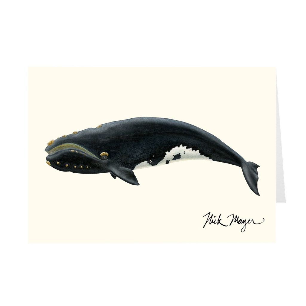 The Right Whale got its name because it was the right whale to harpoon in the days of whaling. They were an easy target due to their gentle nature and were valued for their high blubber content. Because of this they were hunted to near extinction. Even today the North Atlantic Right Whale's population is only 411 individuals and is listed as Critically Endangered. These large 5" x 7" high quality art cards are printed on card stock, come pre-folded, packed in a clear sleeve per 10 cards, and include one white envelope for each card. Cards are blank inside for a personalized message. Printed on recycled paper.