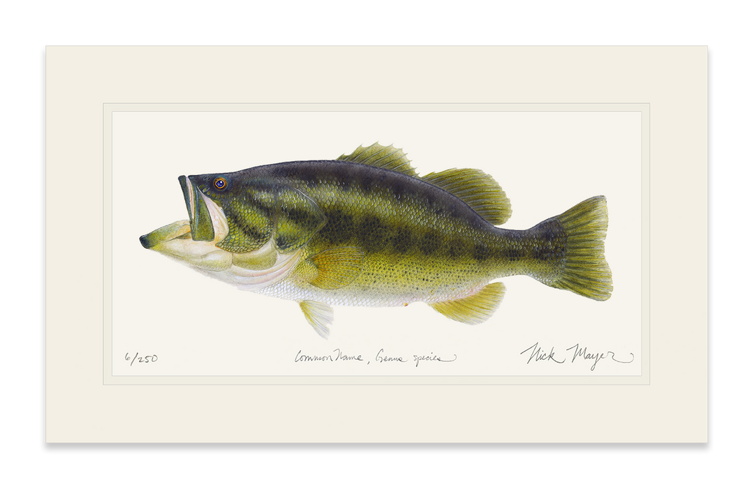 The most popular gamefish in America, you can't go wrong with the Largemouth. Chasing these bucket mouths down is a great excuse for young and old to get outdoors. This painting depicts a mature bass in its prime.