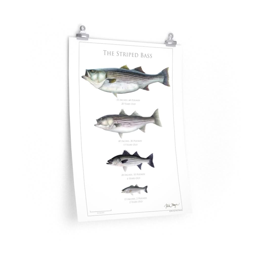 Freshen up your knowledge of this New England iconic gamefish. Features accurate length, age, and weight data of the different striper phases. All images are in scale to one another. Pun intended.