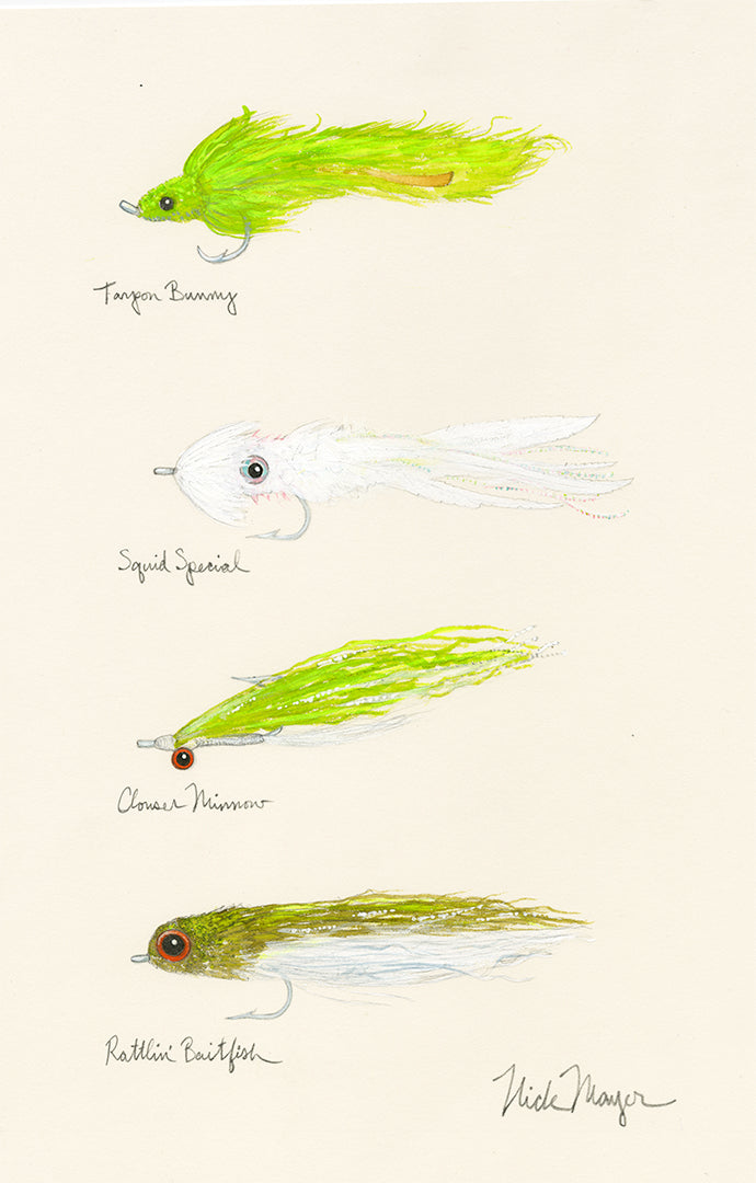 Tarpon Bunny, Squid Special, Clouser Minnow, Rattlin' Baitfish. Here's your chance to own an original watercolor painting. This is unframed and unmatted & ships flat.