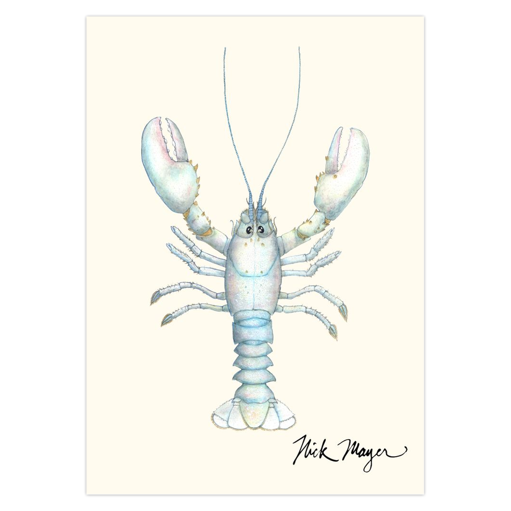 An estimated one in one hundred million Northern Lobsters are albino. This is due to a random genetic variation. Albinos that show a tiny bit of turquoise color like this one are called "Leucistic." These large 5" x 7" high quality art cards are printed on card stock, come pre-folded, packed in a clear sleeve per 10 cards, and include one white envelope for each card. Cards are blank inside for a personalized message. Printed on recycled paper.