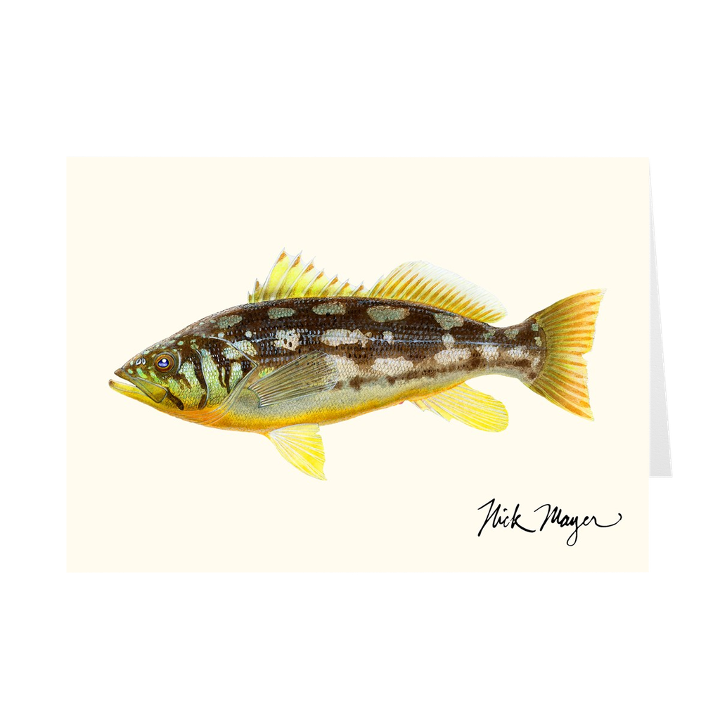 Also called Kelp Bass, these easily identifiable creatures are friends of divers and fishermen alike. Banned from commercial fishing, their numbers are going strong all along the California coast & Baja. These large 5" x 7" high quality art cards are printed on card stock, come pre-folded, packed in a clear sleeve per 10 cards, and include one white envelope for each card. Cards are blank inside for a personalized message. Printed on recycled paper.
