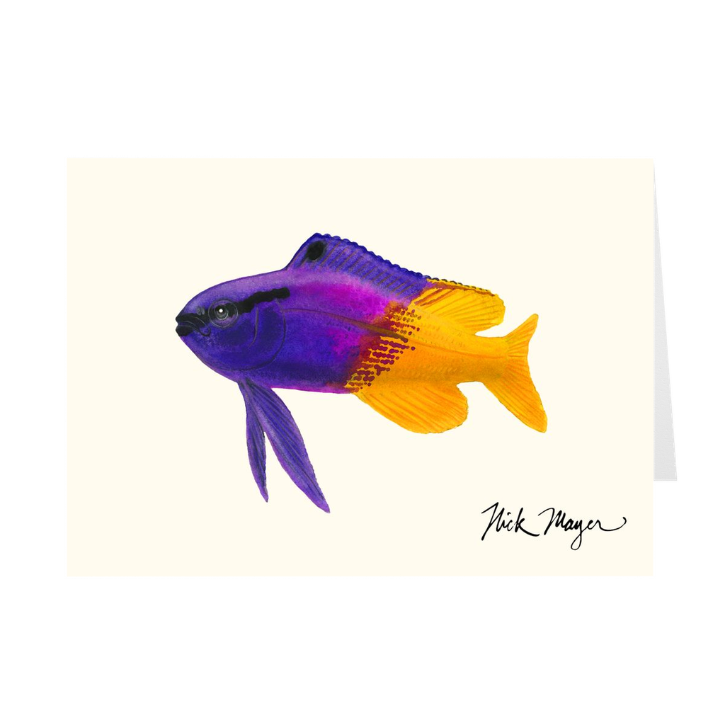 This Western Atlantic species sure dresses nicely for his job. He basically works at a car wash! A fish cleaner, he hangs out at fish cleaning stations all day, picking refuse & parasites off larger fish that come in to get cleaned. These large 5" x 7" high quality art cards are printed on card stock, come pre-folded, packed in a clear sleeve per 10 cards, and include one white envelope for each card. Cards are blank inside for a personalized message. Printed on recycled paper.