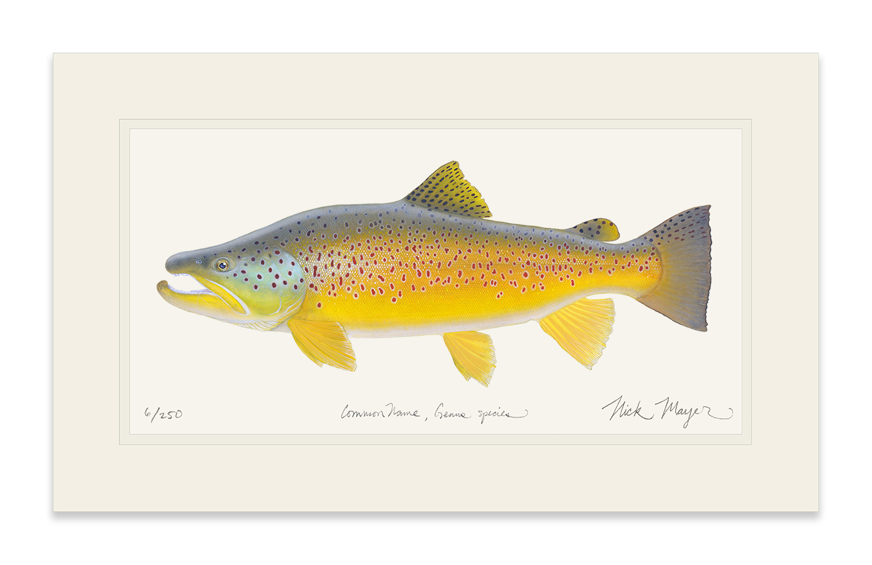 This piece celebrates the stunning colors of a male German Brown trout with its turquoise cheek, reddish spots and pronounced kype. Brown trout have some of the most varied colorations & patterns within a species and some, like this specimen, are absolutely astonishing. Anyone that has landed a fish like this will never forget that moment and this print will truly resonate with anglers that have, or plan to catch a trophy like this one.
