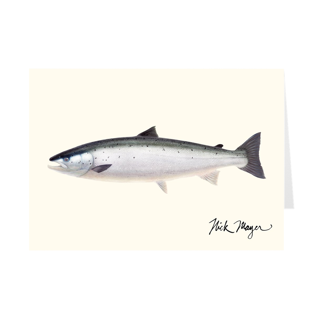 Coined the king of gamefish by Ted Williams, these fish are as magnificent as the wild rivers they inhabit. Wild Atlantic Salmon populations are on a steep decline and heroic organizations such as the Atlantic Salmon Federation are working to save these creatures and their habitat from extinction. These large 5" x 7" high quality art cards are printed on card stock, come pre-folded, packed in a clear sleeve per 10 cards, and include one white envelope for each card. Cards are blank inside for a personalized message. Printed on recycled paper.
