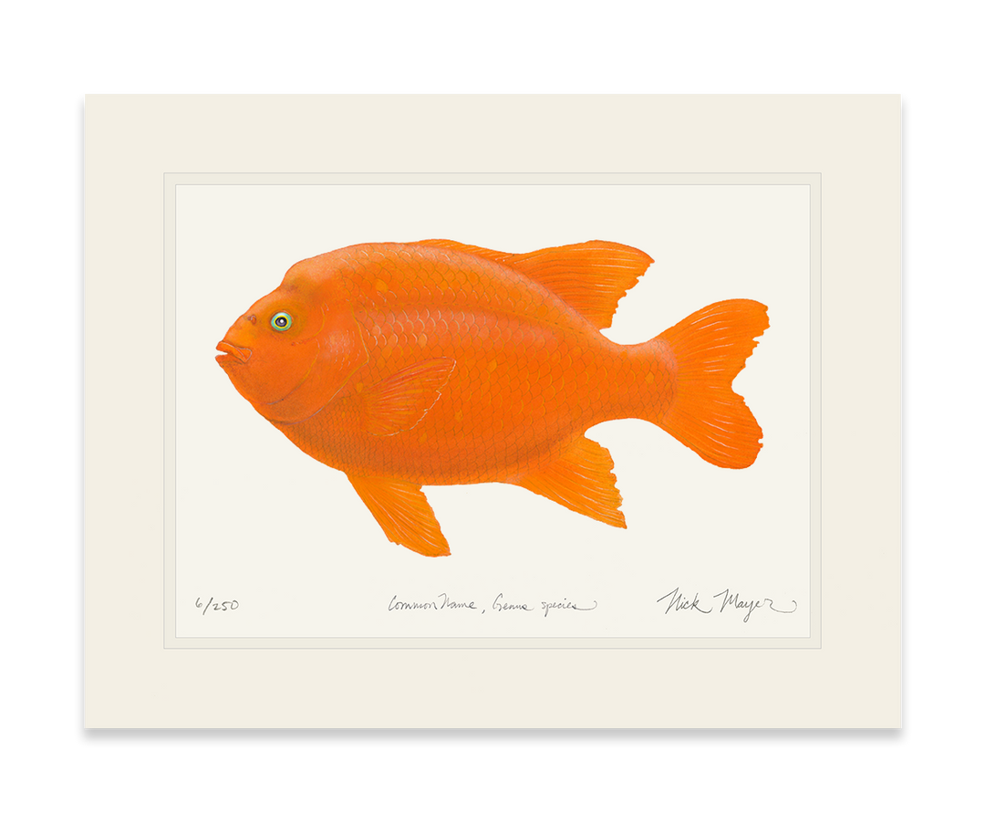 This Bull Garibaldi is a symbol of Catalina Island, California where they are protected from both commercial and recreational fishing. Because of the conservation efforts, these fluorescent orange fish can be seen swimming in the water everywhere along the Catalina shoreline. This piece will be a perfect addition to your California home.