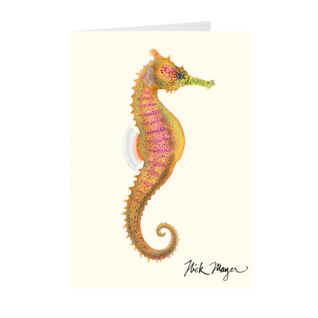 This beautiful work of nature is unique in the animal kingdom in that the males actually brood the eggs and then give birth. These large 5" x 7" high quality art cards are printed on card stock, come pre-folded, packed in a clear sleeve per 10 cards, and include one white envelope for each card. Cards are blank inside for a personalized message. Printed on recycled paper.