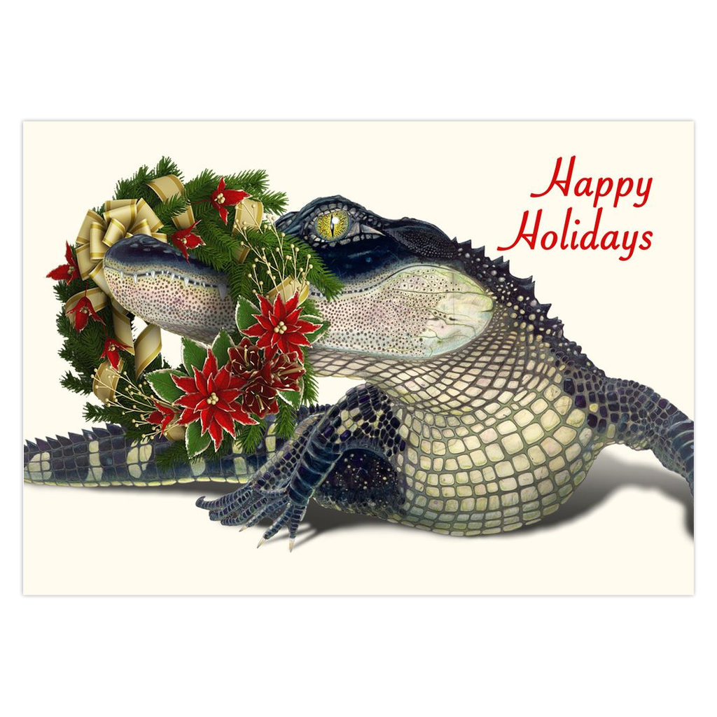 These large 5" x 7" high quality Alligator Holiday cards are printed on card stock, come pre-folded, packed in a clear sleeve per 10 cards, and include one white envelope for each card. Printed on recycled paper.