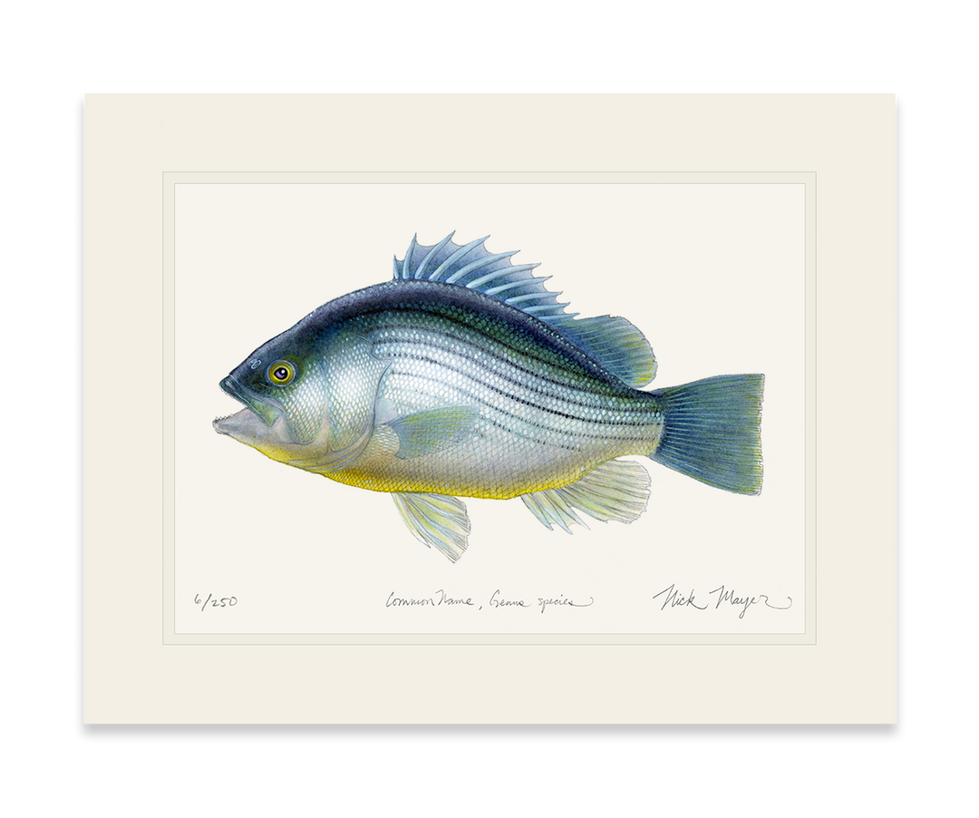Probably Nick's most interesting assignment to date. This piece is a reconstruction of 50 million year old fossil from the Green River Formation in Wyoming. In order to determine the likely real-life coloration of this fish, Nick had a series of correspondences with Dr. John Whitlock of Mt. Aloysius college, an expert on this species' lineage. Serrata's closest relatives are the Moronids--Striped Bass, Yellow Bass, White Bass. Surely a perfect geeky conversation piece for your home or office.