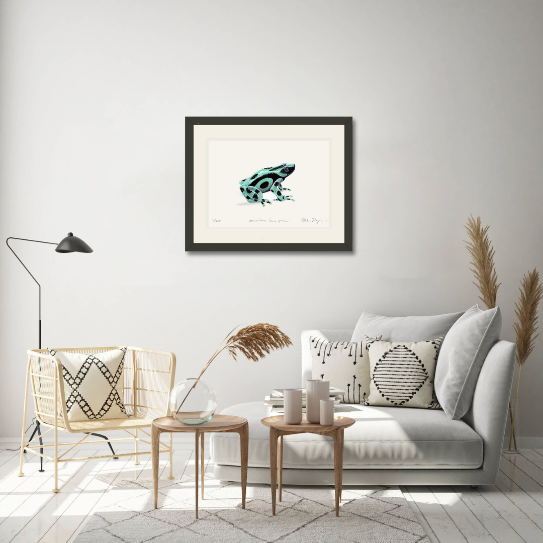This painting was inspired by looking back over my childhood sketchbooks and rekindling my sense of awe and wonder at the natural world, using vibrant colors. The colors of this frog are not dramatized, they really are this electric in real life! The brilliant blue signals to predators that the frog is deadly poisonous. Native to Central & South America, native hunters use the poison from the frog's back to poison their blowgun dart heads. The black spot pattern is unique to each individual. Hand-signed print on archival watercolor paper.
