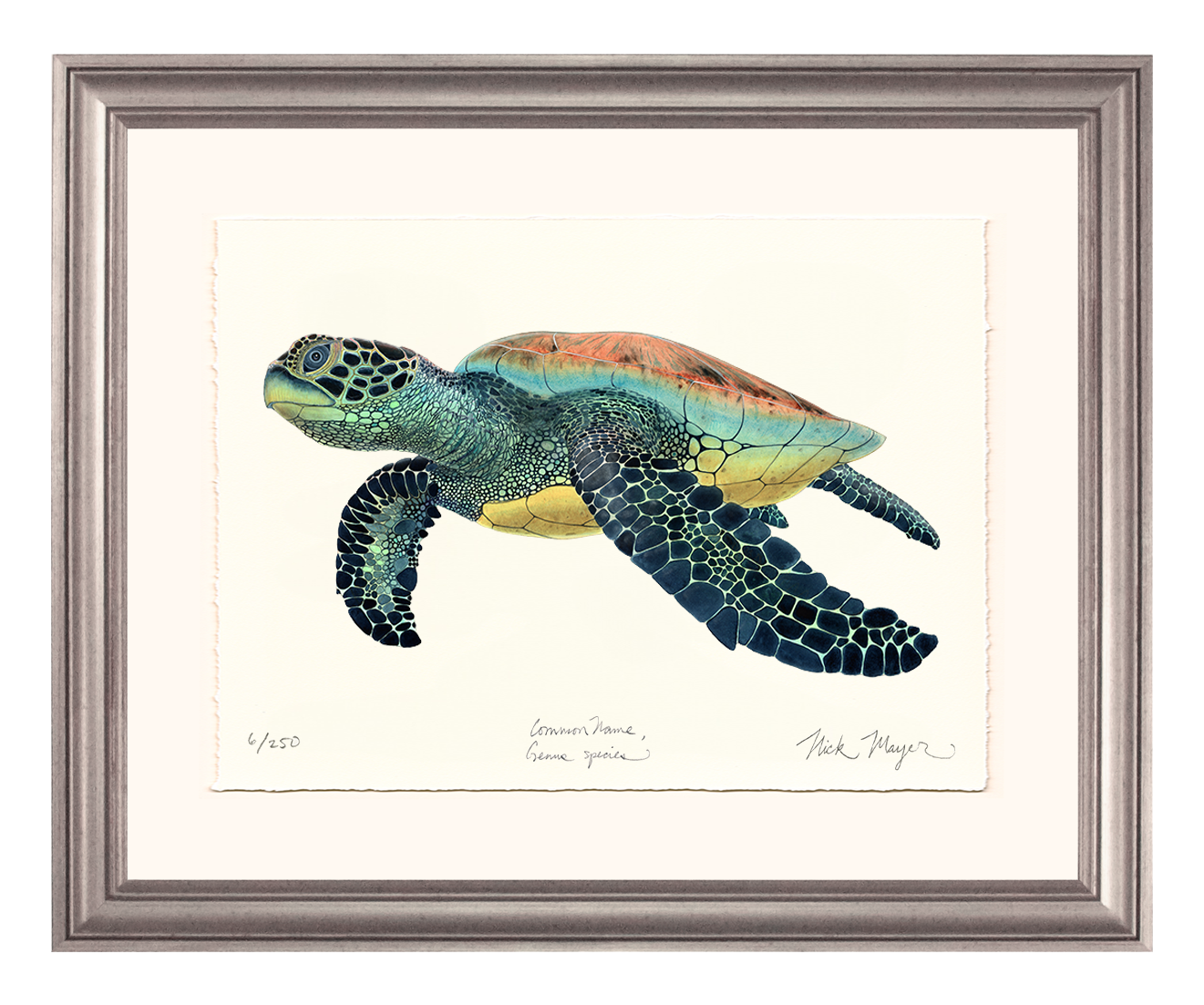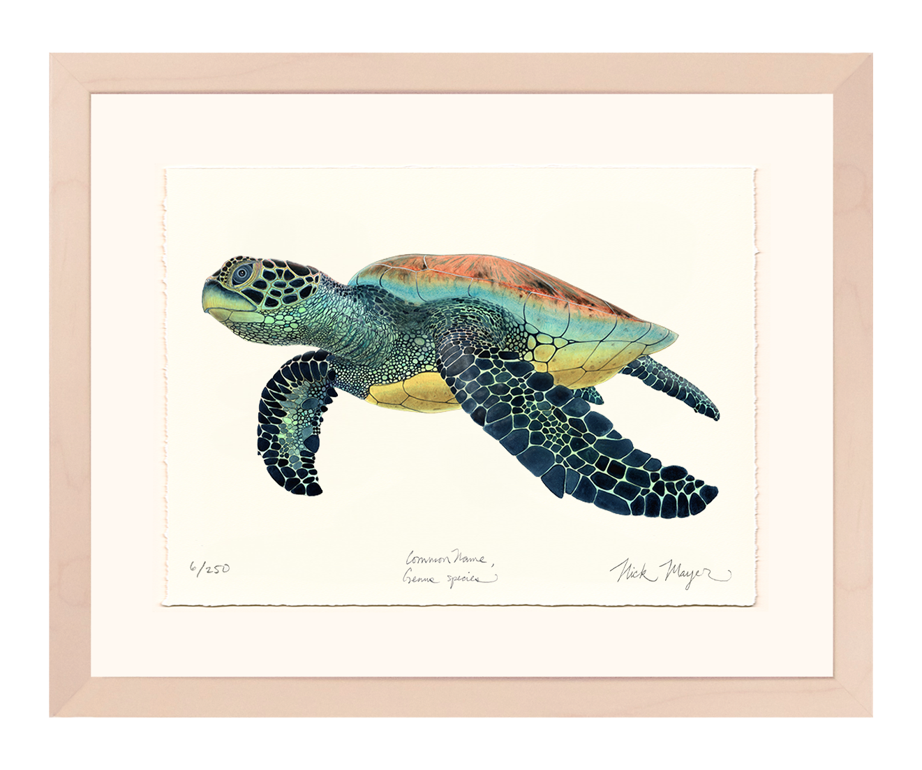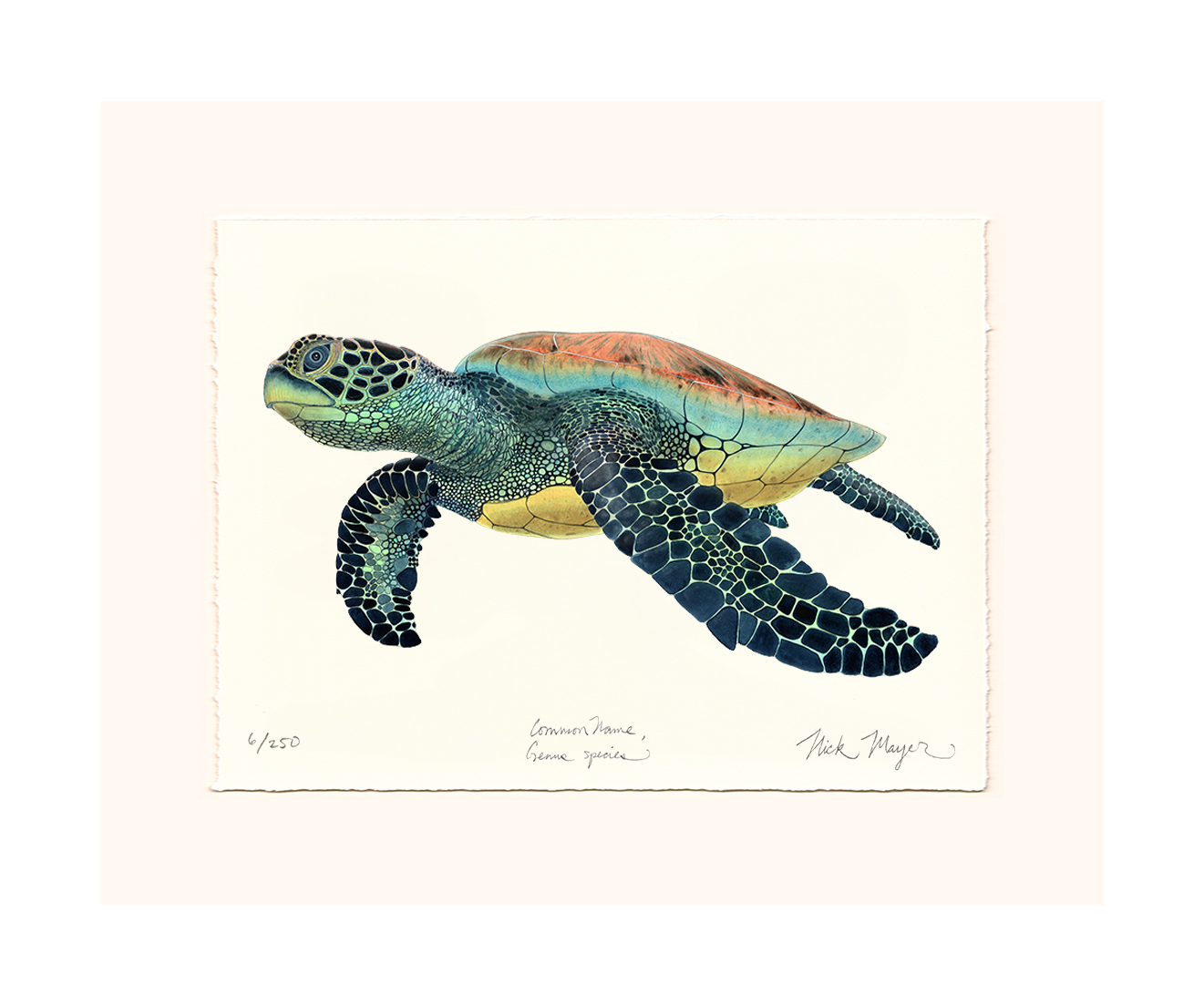 The Green Sea Turtle is found in both the Pacific and Atlantic Oceans. They have strong "nesting site fidelity" which means they will migrate thousands of miles and then come back to the same exact location every year to nest. The painting used to create these prints was inspired by the turtles Nick worked with on the beaches of Tortuguero, Costa Rica while there doing research with the Carribean Conservation Corporation.