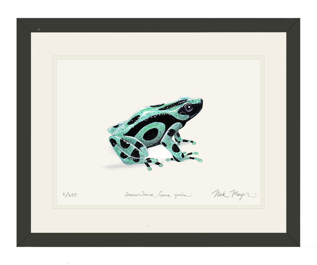 This painting was inspired by looking back over my childhood sketchbooks and rekindling my sense of awe and wonder at the natural world, using vibrant colors. The colors of this frog are not dramatized, they really are this electric in real life! The brilliant blue signals to predators that the frog is deadly poisonous. Native to Central & South America, native hunters use the poison from the frog's back to poison their blowgun dart heads. The black spot pattern is unique to each individual.