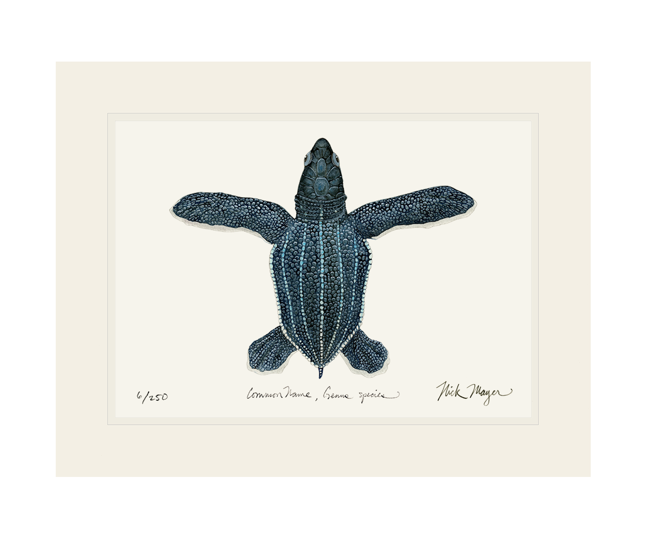 The painting used to create these prints was inspired by the turtles Nick worked with on the beaches of Tortuguero, Costa Rica while there doing research with the Sea Turtle Conservancy. Nick was part of the first team to ever tag Leatherbacks at the Phipps Research station in 1996.
