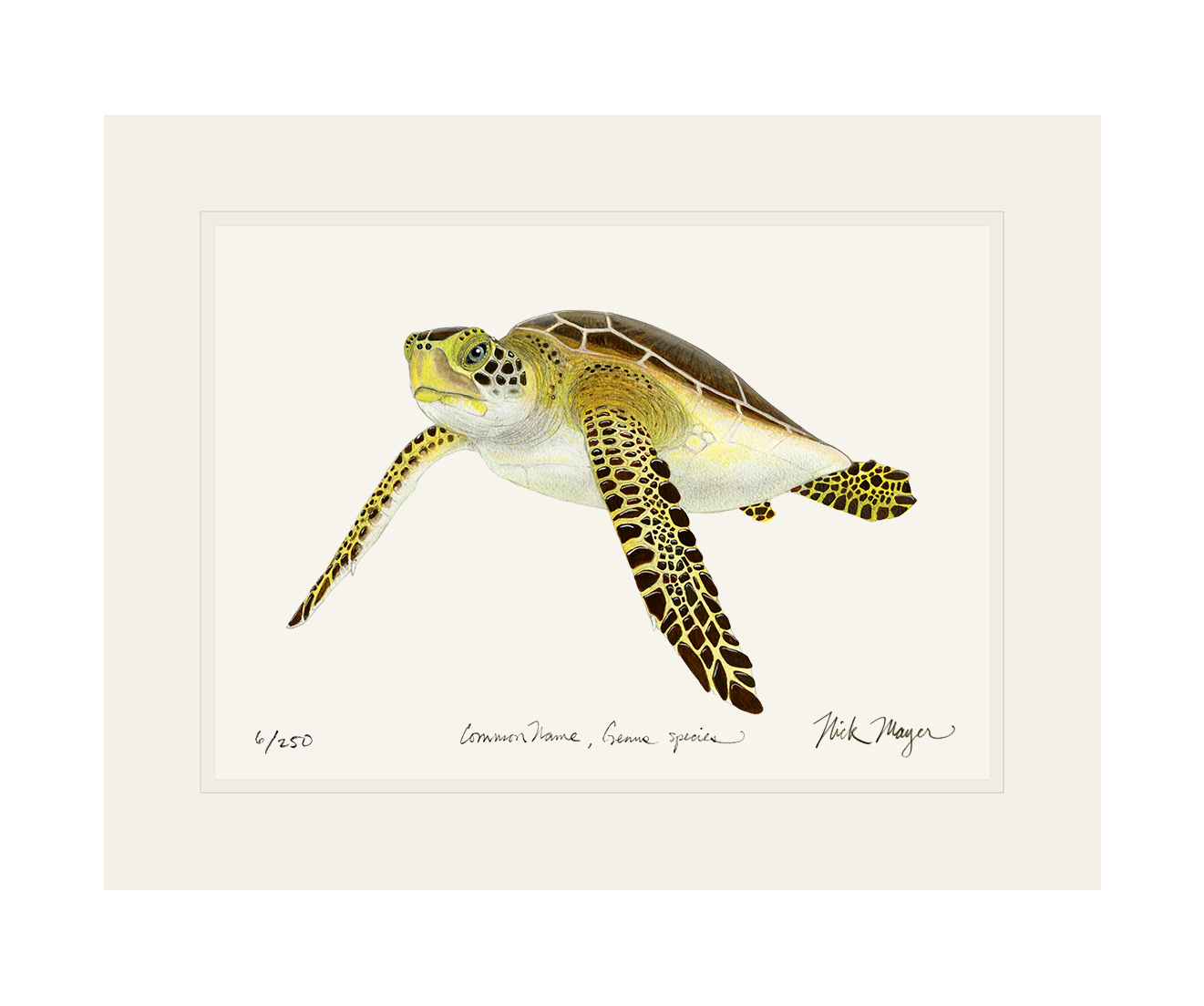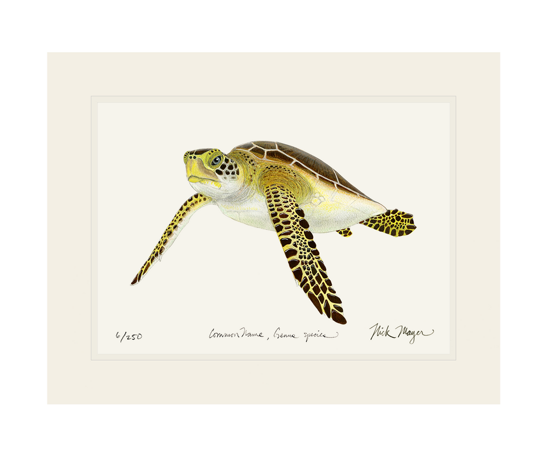 The Green Sea Turtle is found in both the Pacific and Atlantic Oceans. They have strong "nesting site fidelity" which means they will migrate thousands of miles and then come back to the same exact location every year to nest. The painting used to create these prints was inspired by the turtles Nick worked with on the beaches of Tortuguero, Costa Rica while there doing research with the Sea Turtle Conservancy.