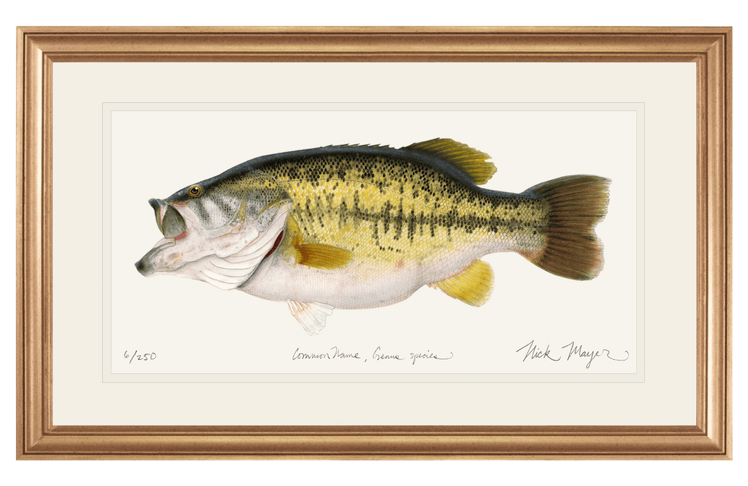 The most popular gamefish in America, the Largemouth Bass is an iconic species. This painting celebrates one of the most massive bucketmouths ever caught, an 14.83 lb, 25.5" from Texas, painted at exact actual size. The painting was commissioned by Texas Parks & Wildlife for the cover of their March 2024 magazine. Sharelunker is the name given by TX P&W for any bass over 24" or 8 lbs. I painted every scale multiple times and even painted the capillaries in the lip. At 25.5" long this painting has a true presence. Feel free to reach out with any questions or if you would like some closeup images to check out.
