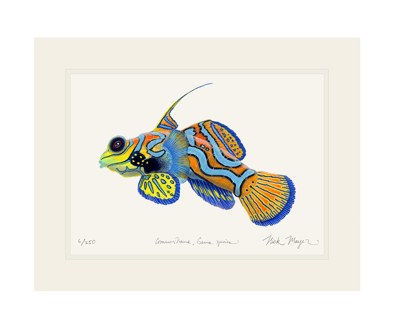 I wanted to paint this fish for years, so glad I finally made it happen. The first time I saw a photo of one I was completely blown away. I had previously thought the Clown Triggerfish was the most ornately colored fish on the planet, now I think it is the Mandarinfish. On one hand this was so much fun to paint because of the crazy vibrant, saturated colors. On the other hand it was a mind-bending technical challenge to come up with the sequence of how to layer the different colors and make the pectoral fin look translucent. As is often the case in nature the Mandarinfish's bright colors signal that they are deadly poisonous, so they have no predators other than humans. 5% of this print's sales are donated to Oceana, an organization dedicated to saving the world's oceans.