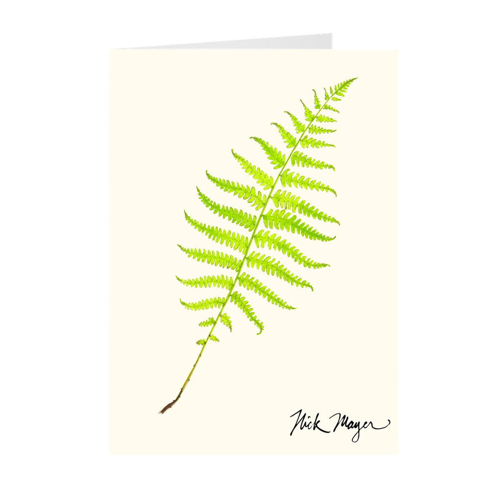 This elegant portrait of the Marsh Fern was painted from a live specimen Nick collected near his studio in Lincoln, Vermont. The original painting used to create these prints was done in watercolor. This species is found in lush, cool areas of the forests that are perfect for "nature bathing." These large 5" x 7" high quality art cards are printed on card stock, come pre-folded, packed in a clear sleeve per 10 cards, and include one white envelope for each card. Cards are blank inside for a personalized message. Printed on recycled paper.