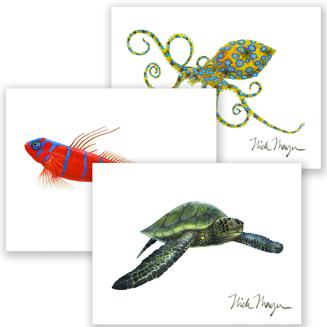 I have a limited supply of A2 size cards left in stock. This is an assortment of 12 cards & envelopes that I pick from what I have in stock. I cannot guarantee you any specific cards, but you can give me a theme in the Notes section at check out and I will do my best to find you some cards along those lines, for example you could request "Freshwater Fish" or "Florida Species" etc.
