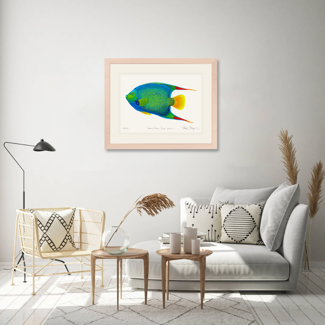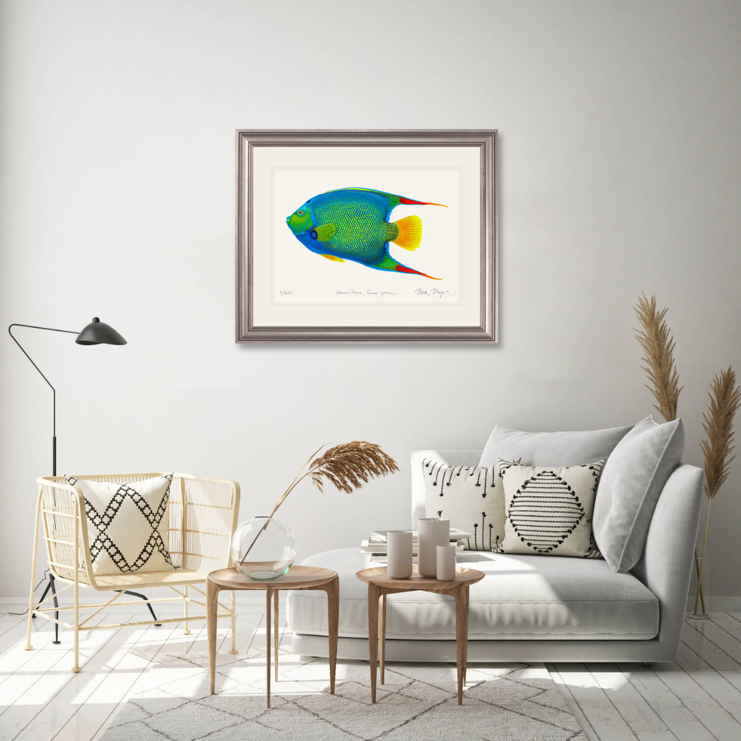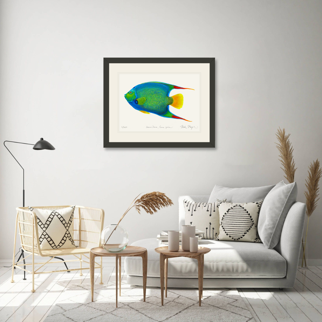 The Queen Angelfish is one of the most vividly colored creatures on the globe. With neon blues, greens, yellows, and reds, this fish and this print are stunningly beautiful. Queen Angels are named for their polka-dotted blue and black crown on their head. They are found in the Western Atlantic Ocean and primarily eat marine sponges. Their maximum size is about 18" long. 5% of the sales from this print are donated to Oceana, an organization dedicated to saving the world's oceans.
