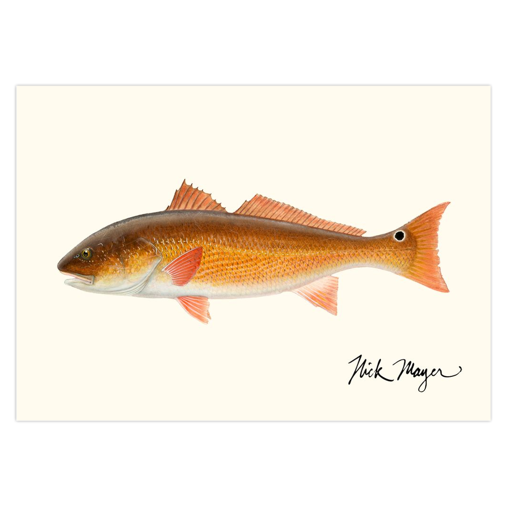 Also called Red Drum, the Redfish is one of the most popular fish in the American South. This painting depicts a healthy fish in its prime with vibrant colors and little wear and tear. Their signature feature is the black spot on their tail--if you see this sticking out of the water in the marsh, it's a Redfish. These high quality art cards are printed on card stock, come pre-folded, packed in a clear sleeve per 10 cards, and include one white envelope for each card. Cards are blank inside for a personalized message. Printed on recyclable paper.