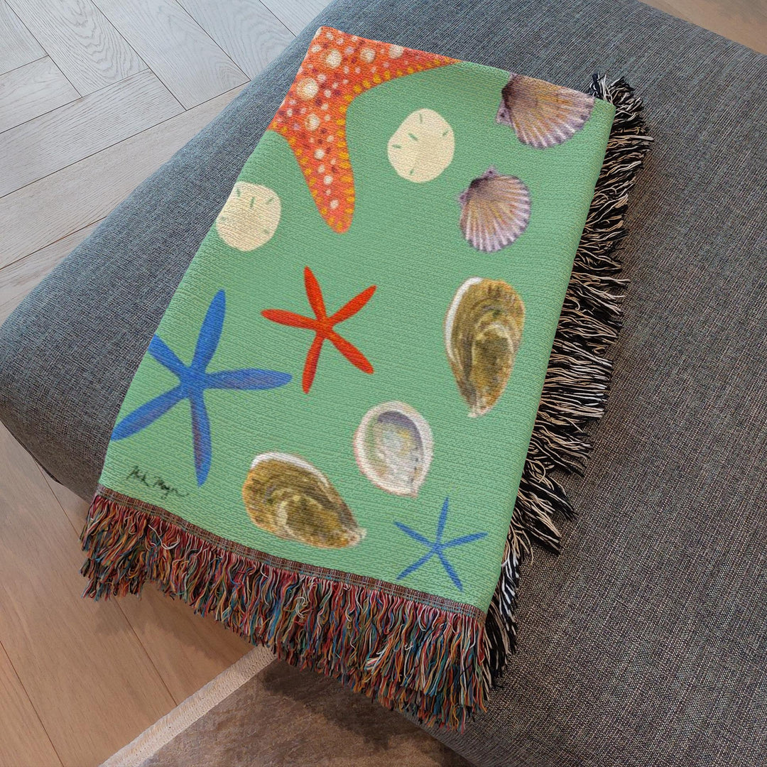 Using an exclusive process Nick's hand-painted art is transformed into woven fabric-- the design is not printed on top, it is actually woven into the fabric itself with many different colors of yarn!! This process culminates in a distinctive and luxurious blanket that is itself a work of art. The 100% cotton yarn is super soft, supple and heavy. Use it as a wall tapestry, a throw for your sofa or even a picnic spread. This durable, warm blanket with colorful fringed edges is the perfect functional art.