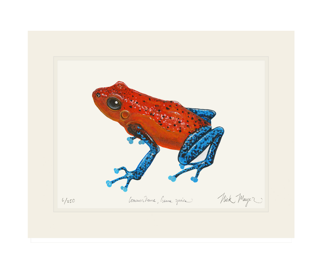 This painting was inspired by looking back over my childhood sketchbooks and rekindling my sense of awe and wonder at the natural world, using vibrant colors. I also used to see these guys on a regular basis when I worked in Tortuguero, Costa Rica doing research on sea turtles. They're tiny! The colors of this frog are not dramatized, they really are this electric in real life! The brilliant red & blue signals to predators that the frog is deadly poisonous. Native to Central & South America, native hunters use the poison from the frog's back to poison their blowgun dart heads. Hand-signed giclee print on archival watercolor paper.