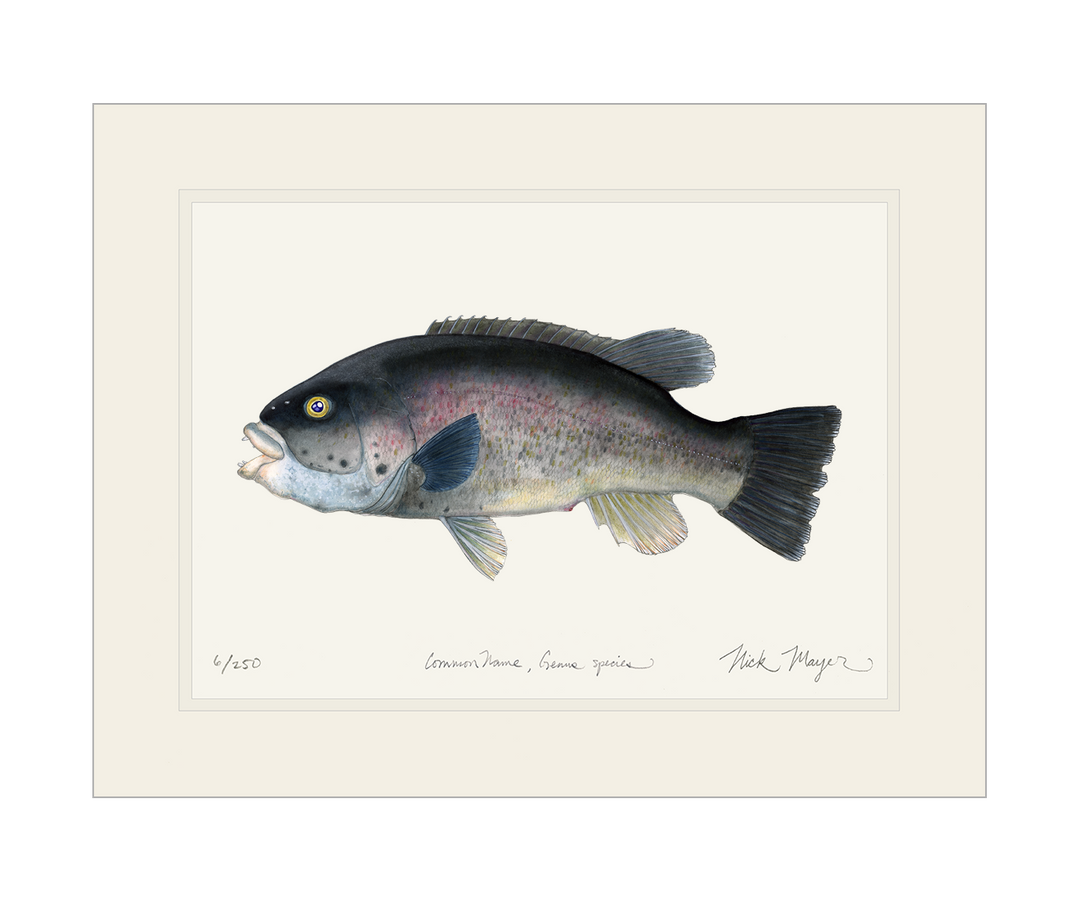 Although a lesser known species, the Tautog (also called Blackfish) is a common inhabitant of the rocky shorelines of New England. The males have a characteristic white chin and salt and pepper coloration as the one depicted here, while the females sport a brownish calico pattern.