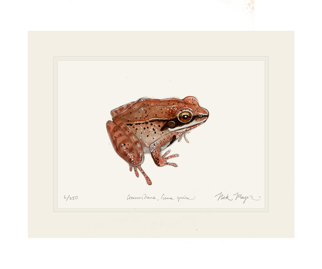This painting was inspired by the annual chorus of Wood Frogs that come to the pond outside of my studio here in Vermont. Wood Frogs are a land-based frog. They are not tree frogs and only come to vernal pools to mate, the rest of the time they inhabit the mossy, swampy areas of the forest. So to me they are a symbol of the north woods much like a Whitetailed Deer. Hand-signed print on archival watercolor paper.