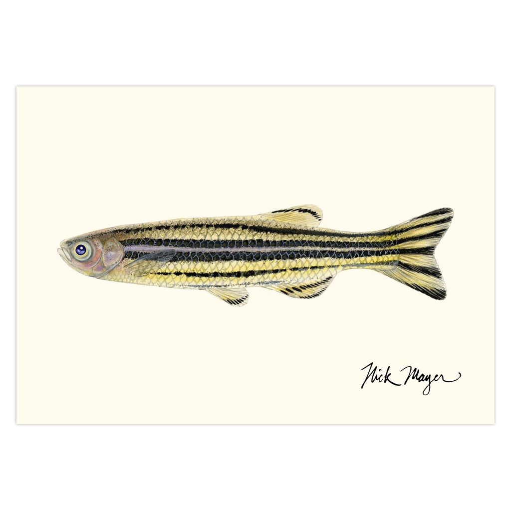 Zebrafish are native to the rivers of India and are commonly kept at aquarium fish. Their embryos are almost completely transparent, allowing researchers to visualize organ development and biological processes in living, breathing fish without invasive procedures. These high quality art cards are printed on card stock, come pre-folded, packed in a clear sleeve per 10 cards, and include one white envelope for each card. Cards are blank inside for a personalized message. Printed on recyclable paper.